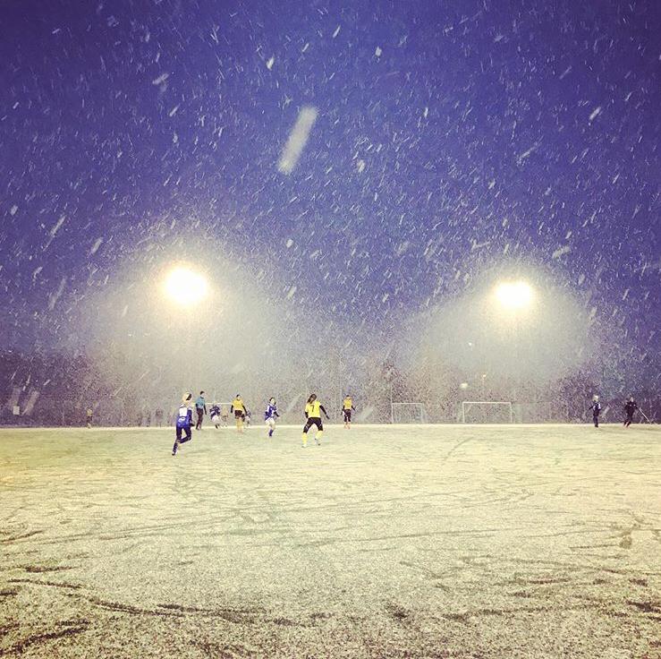 Idag spelade vi en ny träningsmatch i 11-manna. Våra goda vänner Böljan stod åter på andra sidan. Vi hoppades att vädret skulle vara på vår sida men lagom till matchstart så började snöovädret. Det lät dock inte hindra alla 22 tjejer på plan som med härlig entusiasm tog sig an uppgiften.